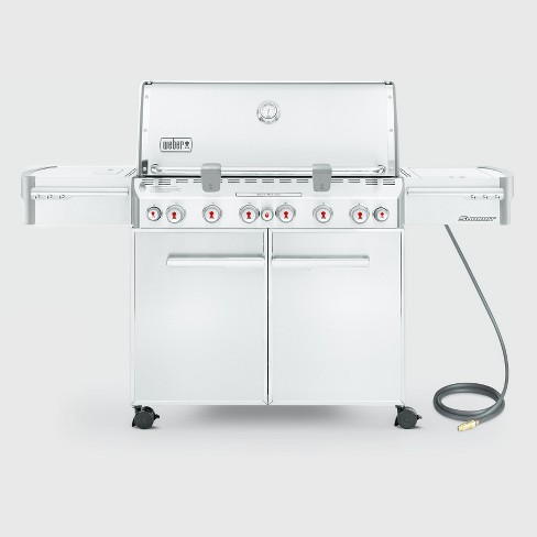 Backed by a 10 year warranty the six burner weber summit s 670 gas grill has a stainless steel finish huge cooking area and two handle lights.